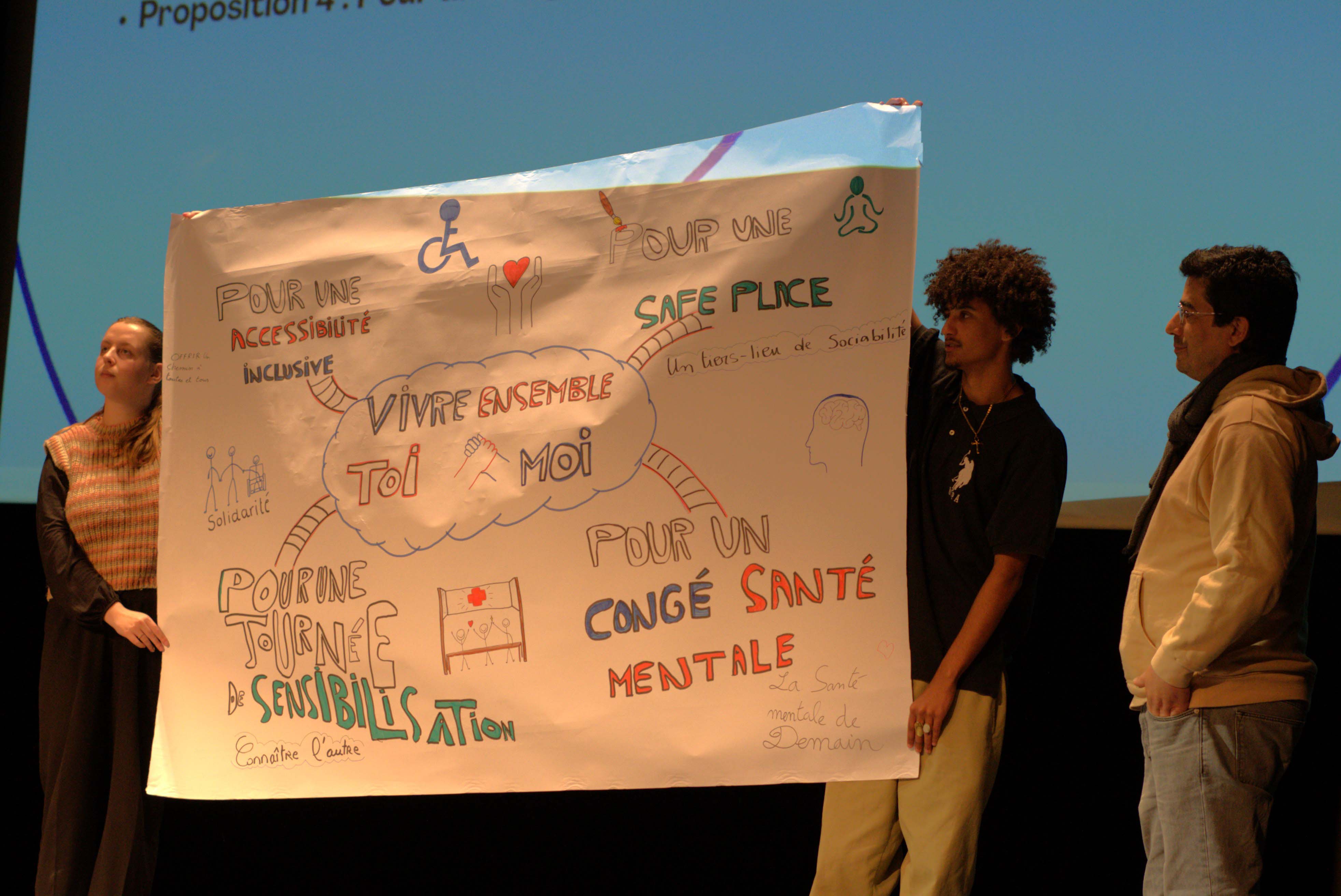 Le dernier après-midi, la scène du théâtre de Fontainebleau a laissé la place aux étudiantes et étudiants qui ont présentés tour à tour les travaux et propositions concrètes sur lesquelles ils ont travaillés pendant ces trois jours. Leur présentation a été ponctuée par la facilitation graphique en live de Renaud Combes . Toutes les personnes présentes ont pu interagir avec les étudiants et partager leurs idées. Les propositions, réunies sur le site collaboratif decidim.u-pec.fr, seront travaillées davantage pendant toute la convention étudiante. Parmi les propositions, nous pouvons citer :